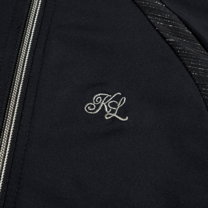 - Cremallera en espiral de metal plateado y tirador de bloqueo automático con logo y cristales.